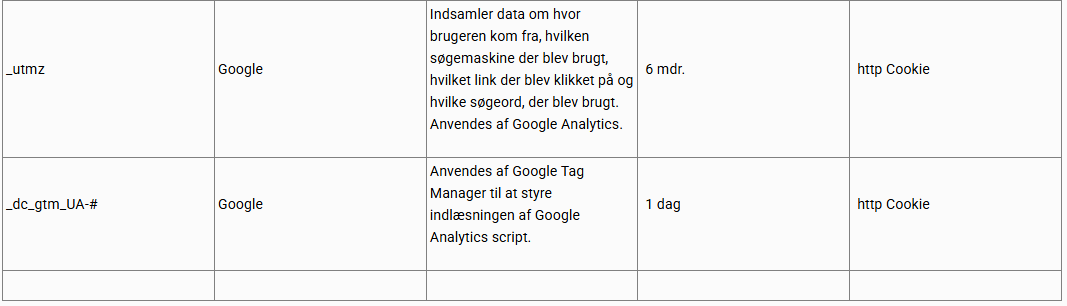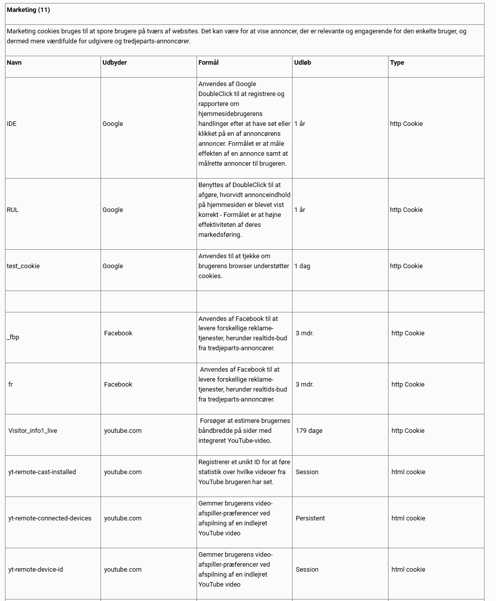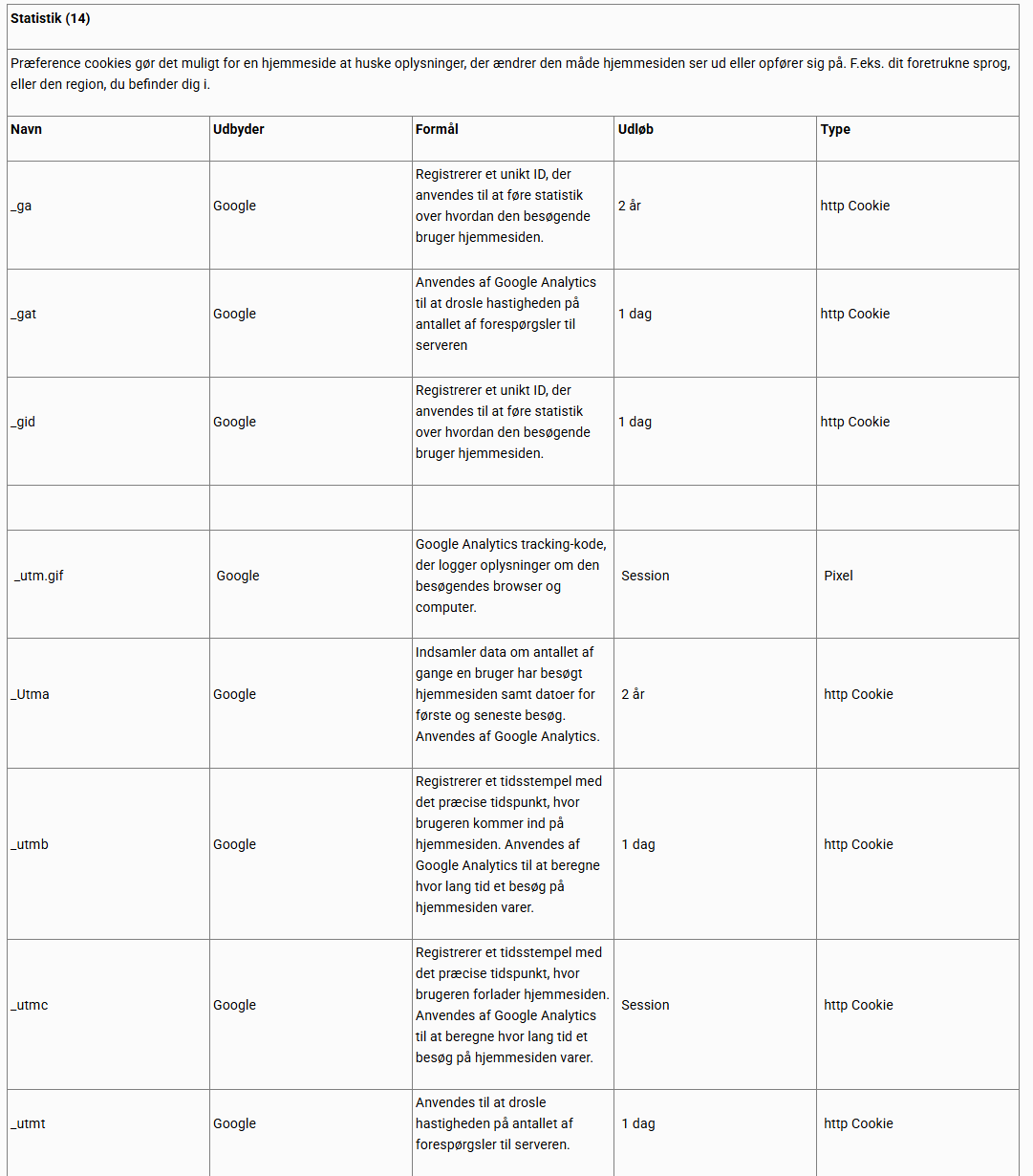 Statistik: Disse cookies gemmer information om antallet af besøgende på hjemmesiden, antallet af unikke besøgende, hvilke sider på hjemmesiden der er besøgt, kilden til besøget osv. Disse data hjælper os med at forstå og analysere hvor godt hjemmesiden fungerer og hvor der skal laves forbedringer. Disse data kan blive delt med tredjepart.